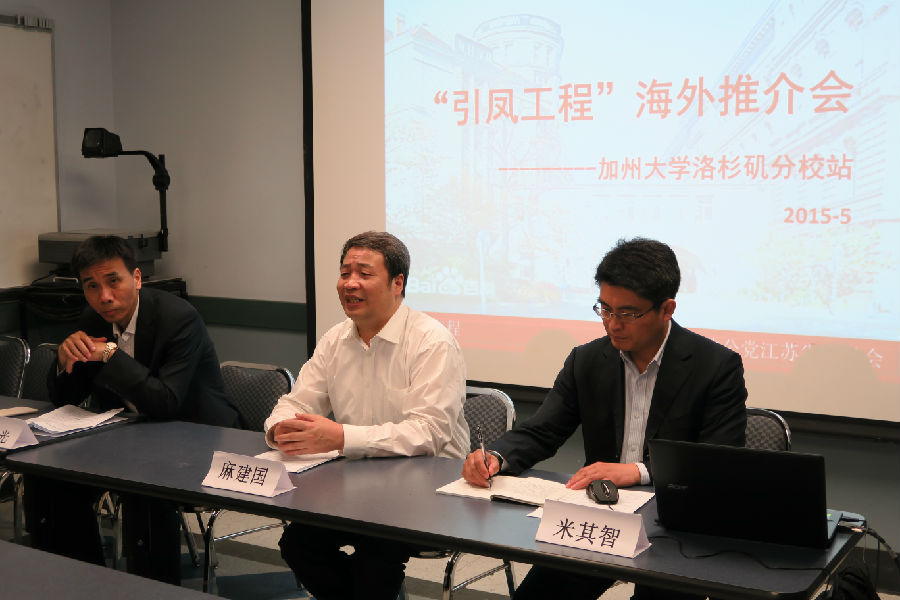 人才兴,事业兴。鼓励留学人员了解江苏和帮助他们回国工作或以多种形式为国服务是致公党江苏省委连续六年举办“引凤工程”的宗旨。因此第六届活动推介会也是此次出访的重要工作任务之一。访问团在加州大学洛杉矶分校、华盛顿安生文教基金会美国总部、普林斯顿大学分别召开了三场座谈推介会。致公党江苏省委主委、访问团团长麻建国分别在三场推介会向海外学者及留学人员,全面介绍江苏经济社会发展情况及致公党江苏省委实施“引凤工程”成效、影响,鼓励海外学子回国或为国服务。访问团成员江苏省信息技术人才市场调研员黄曙光,深入介绍了我省创新创业环境、服务留学人员工作、江苏引才新政、海外人才需求情况。在推介会现场访问团向与会人员赠送了“引凤工程”宣传册、“引凤工程”的专题片,全面介绍第六届活动预定方案,与留学人员开展互动,对他们关心的问题一一作出解答。通过三场推介会,100多名在美攻读博士的留学生及华人专家学者对江苏整体情况有了进一步认识,也激发了他们参与“引凤工程”的兴趣和热情,目前已有多名海外博士预约报名。