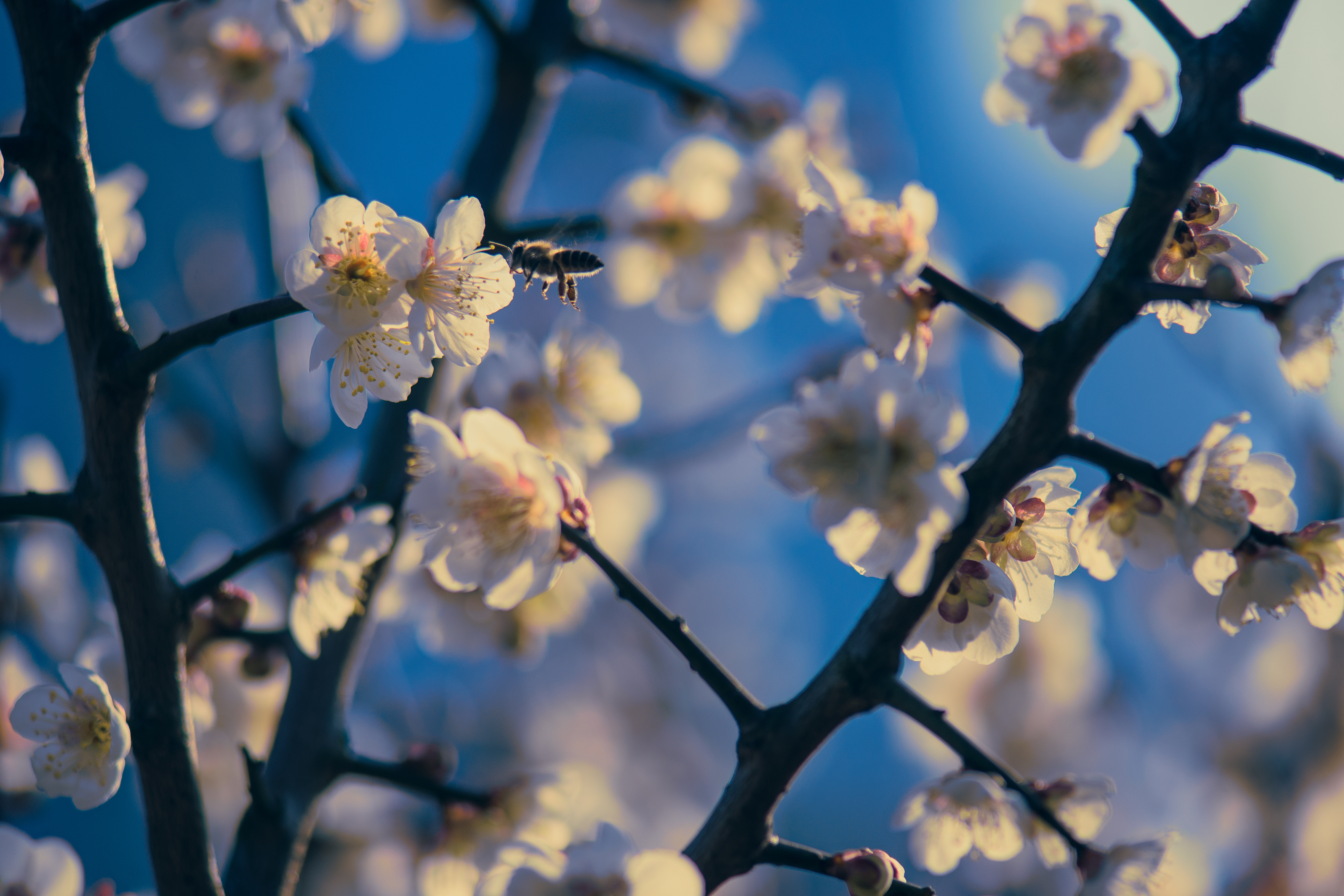 白梅盛开,在阳光下娇羞动人。蜜蜂辛勤、在花丛间走街串巷。