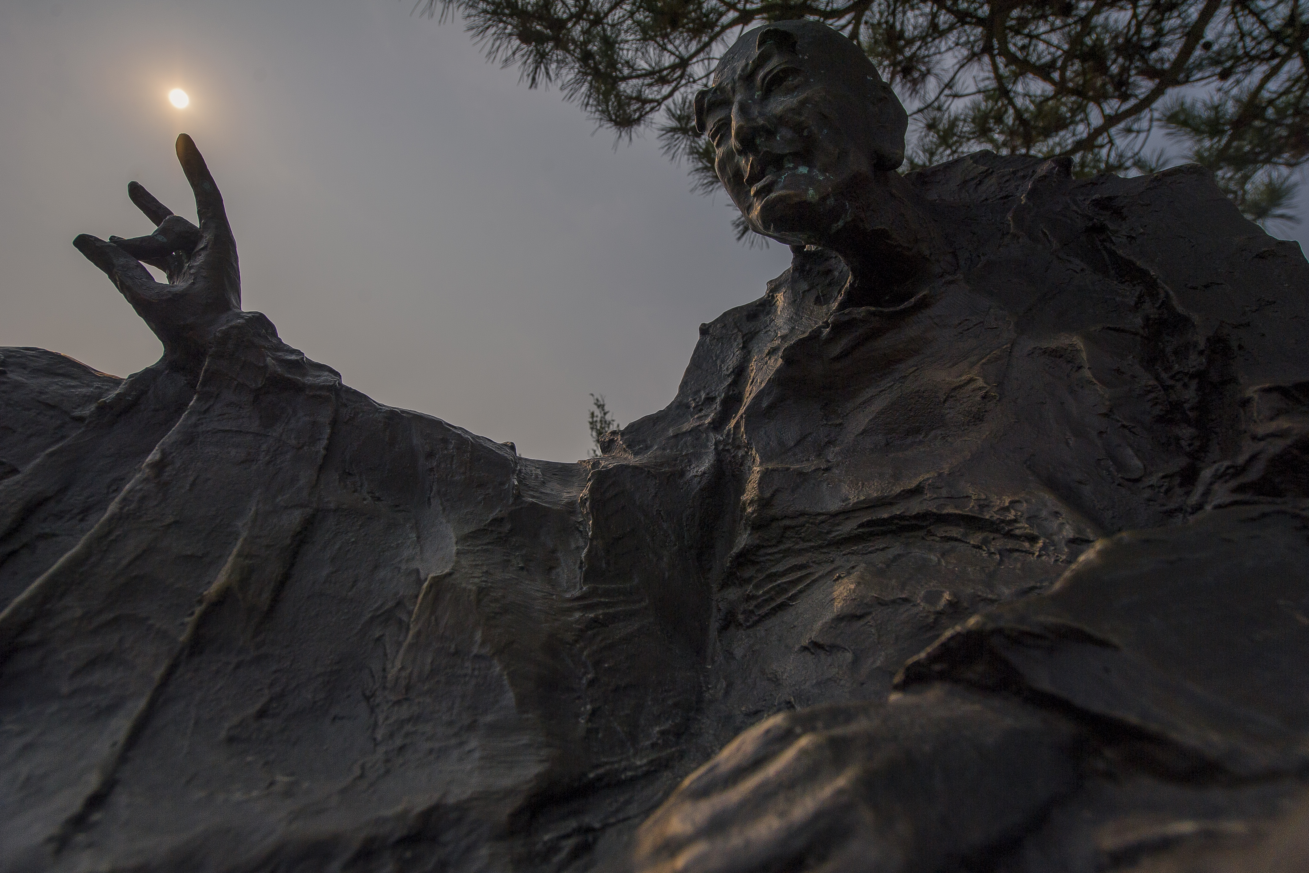 借助一尊法师雕像的造型,与太阳加以结合,阐释注重心灵的觉悟,发现宇宙的真相的思想。