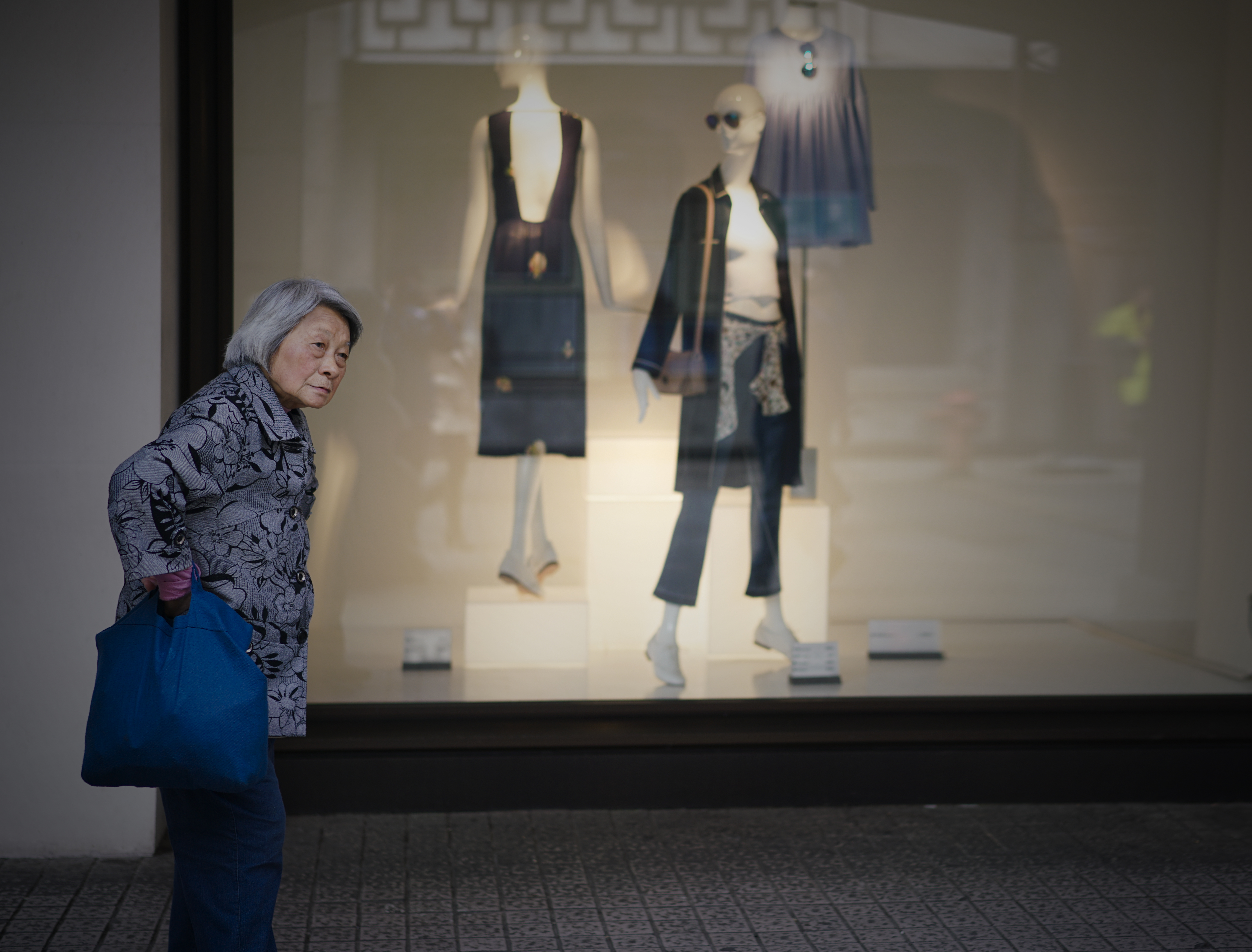 照片解读:1。 画面充满了对比 老奶奶的传统服饰与橱窗内的现代服饰对比 老奶奶的神态与橱窗内模特的神态对比。除了这样的对比,还能感受到老奶奶是一个活生生的人,她是生动的,有故事的,不像橱窗里的模特,她们都是静止的,苍白的没有故事。老奶奶的脸庞很平静,平静正是岁月留下的一种感觉。是她不经意经过这里,我也是恰好经过这里,才定格了这一刻,所以取题《经过》