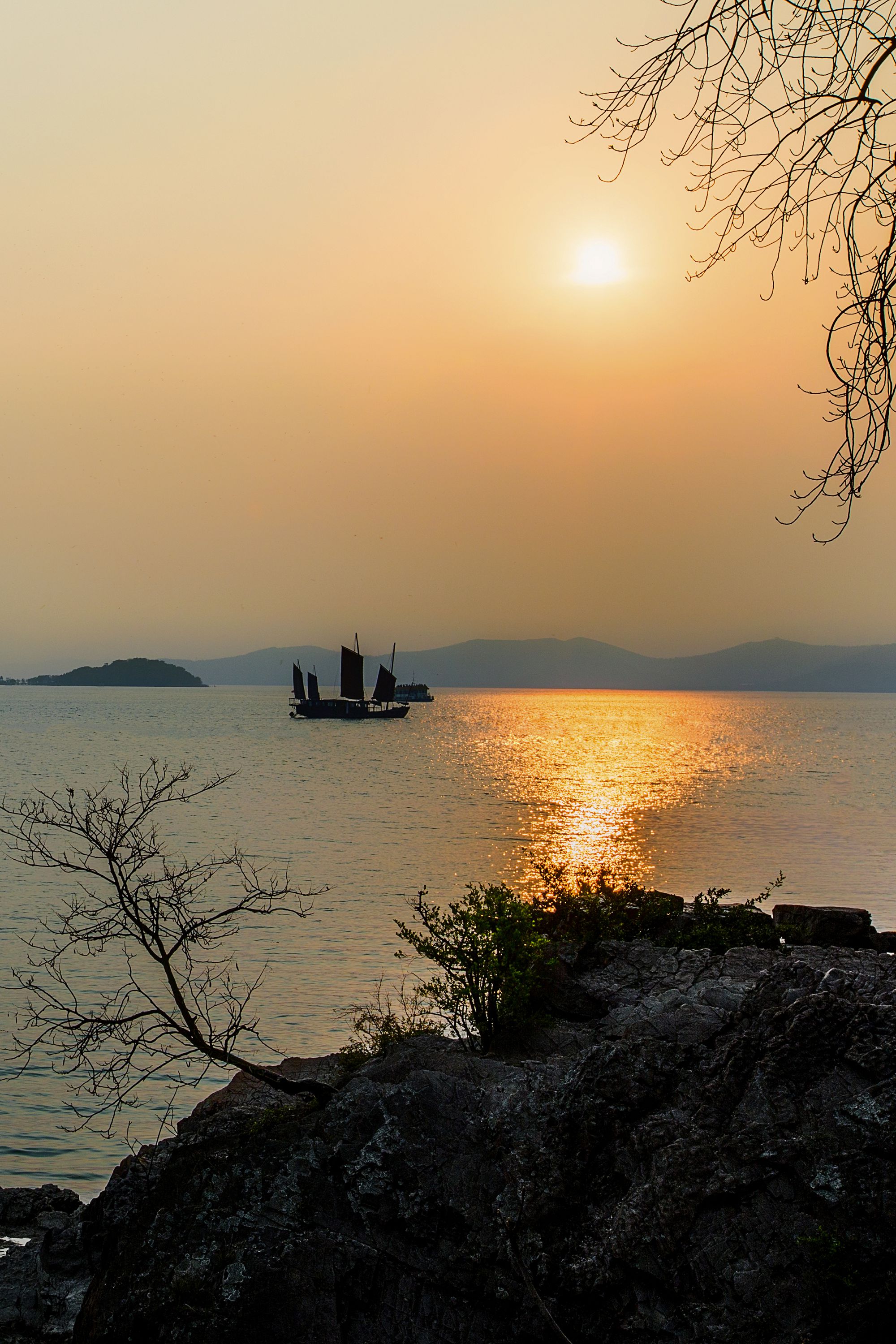 图片介绍:傍晚的太湖,烟波浩淼,夕阳洒金,归帆倒映水面,大美