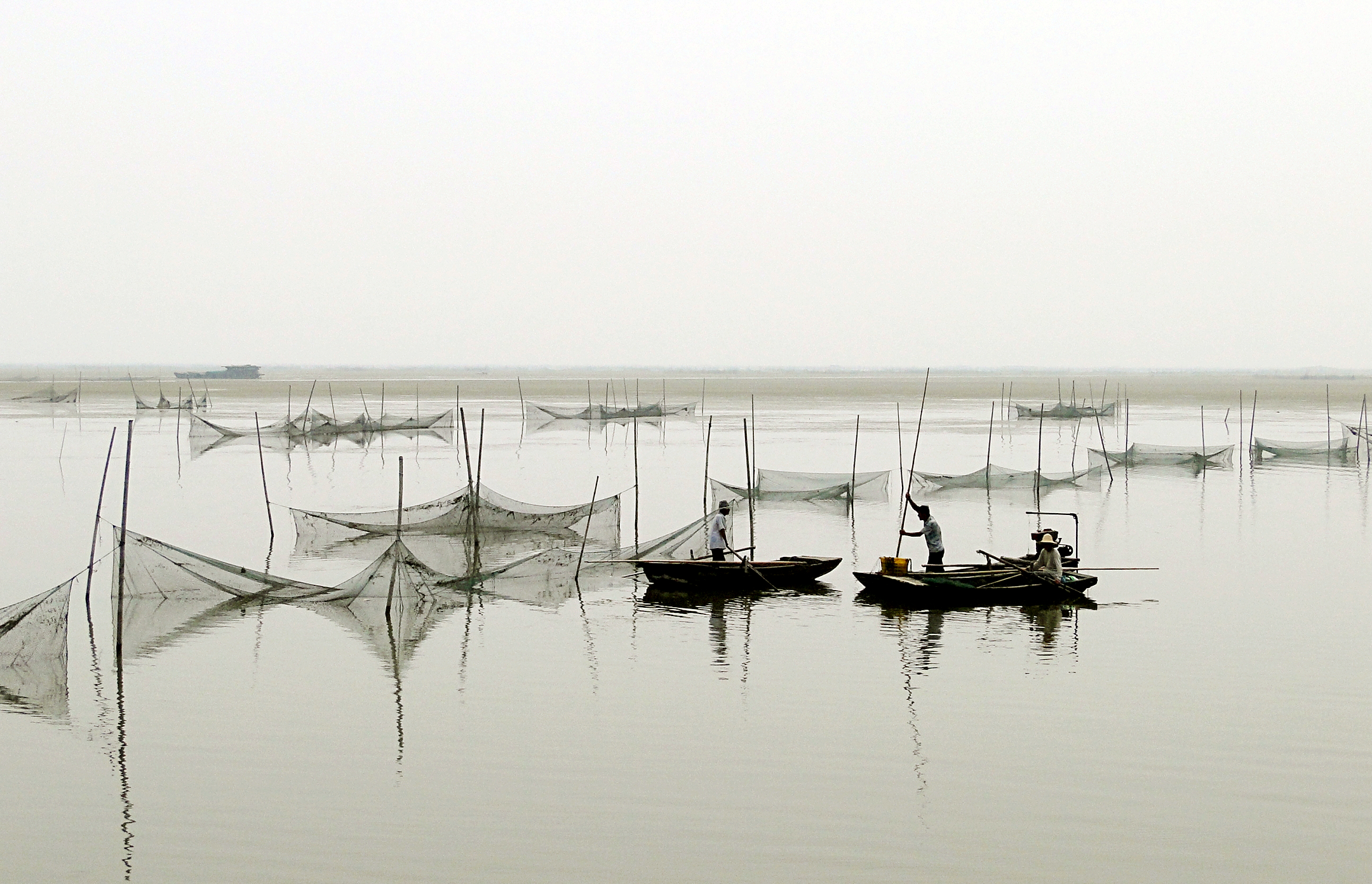 作品说明:临近暮色,仍在辛勤劳作的人们与天水一色的湖水构成一幅水墨画。