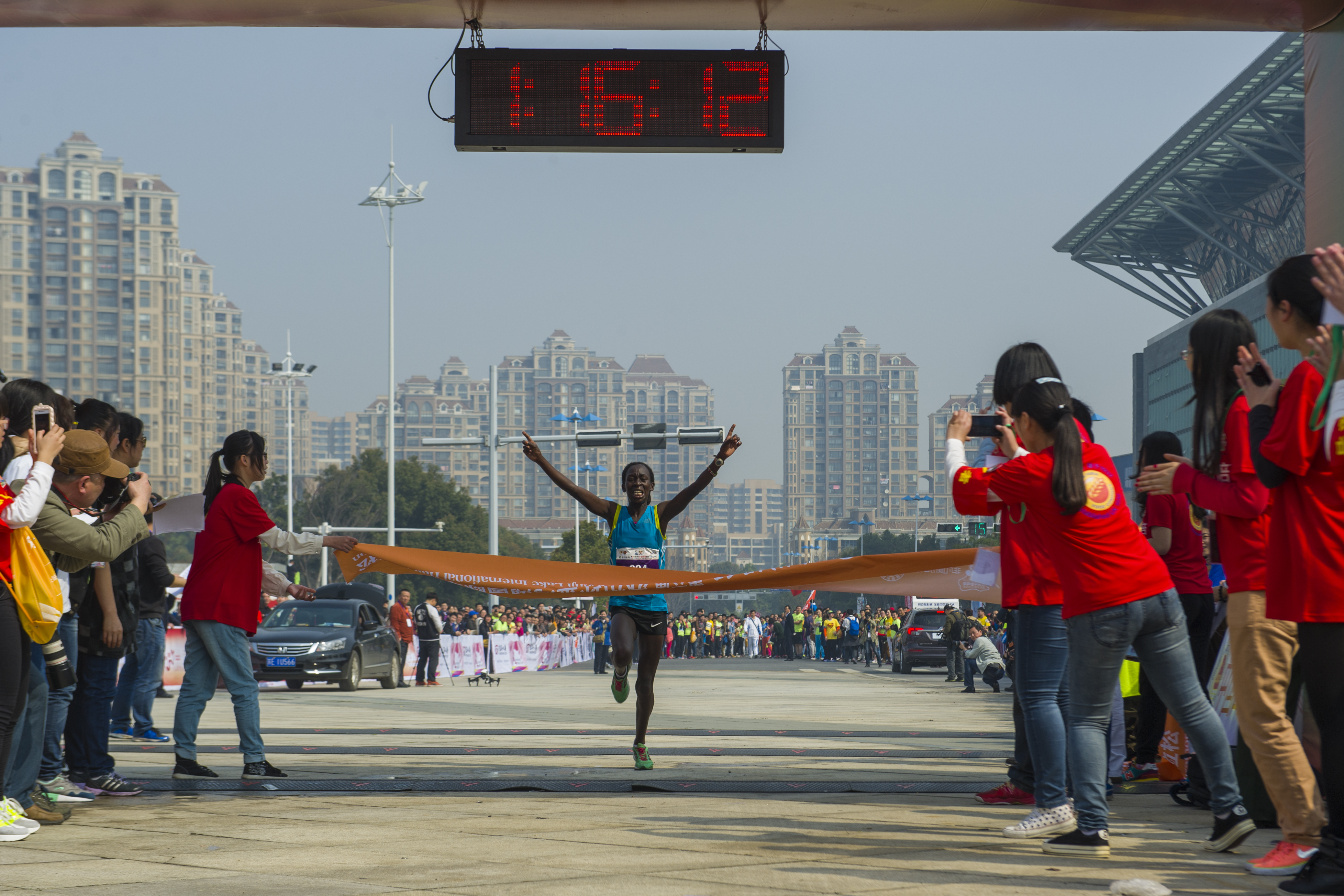 2015年3月29日,2015年金鸡湖半程马拉松比赛举行。各方选手云集赛场,重在参与的体育精神鼓舞着他们。虽然奖项各有得主,可贵的是选手们成功的挑战自己。赛场的意外惊喜,一对结缘于赛场的情侣,在赛后举办了赛场婚礼!