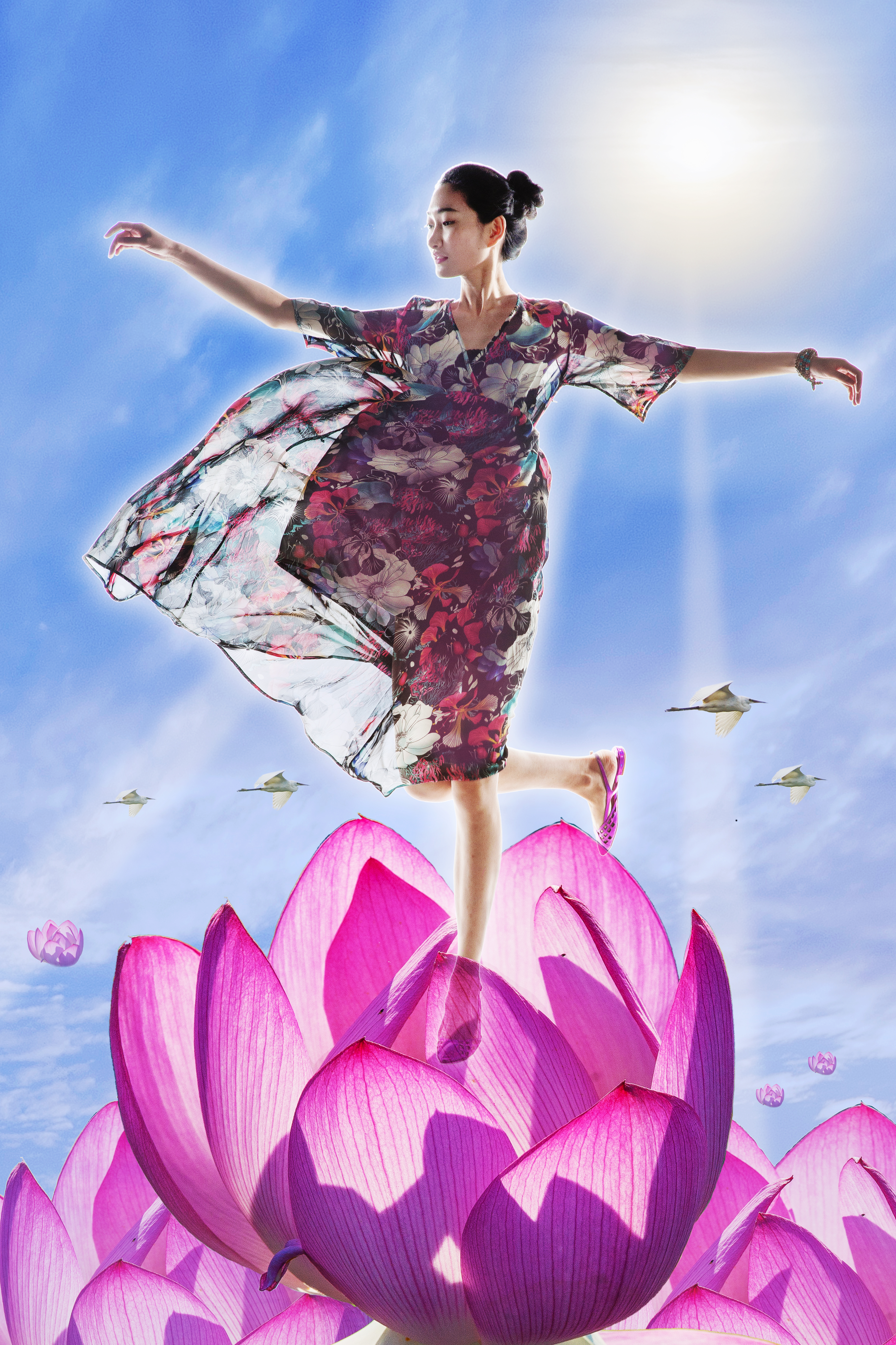 这事一幅创意摄影作品,表现一位凌波仙子在荷花上轻盈曼舞的情景。