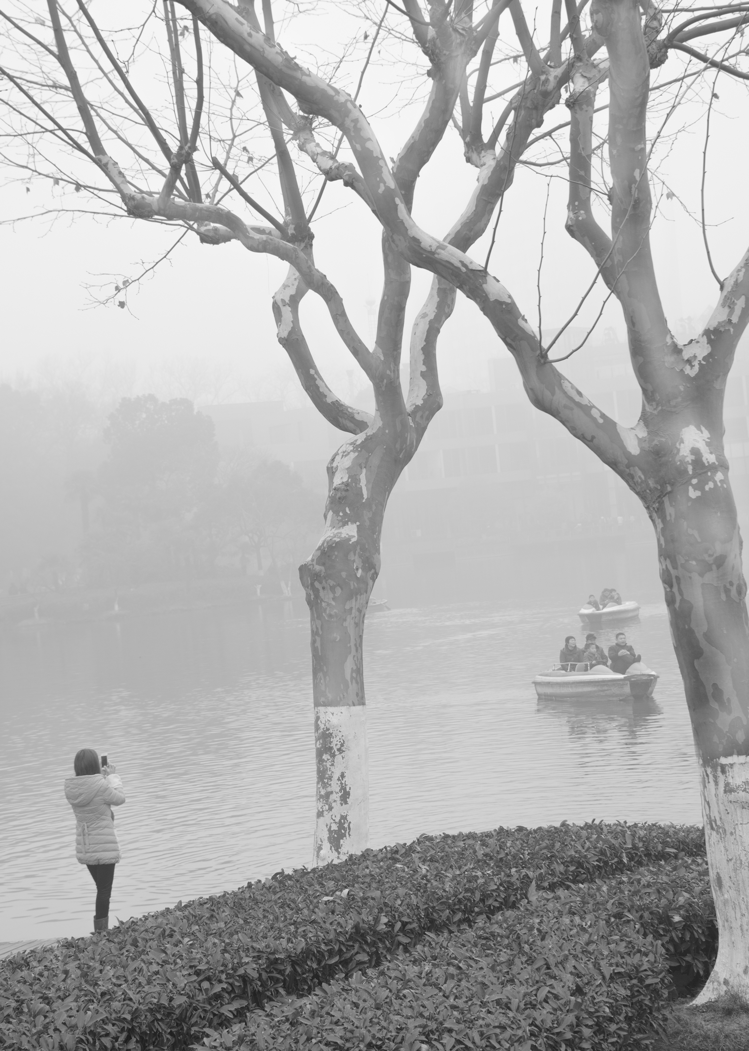 图片介绍:红梅公园,远处的游船、近处的游客和大树,黑白处理