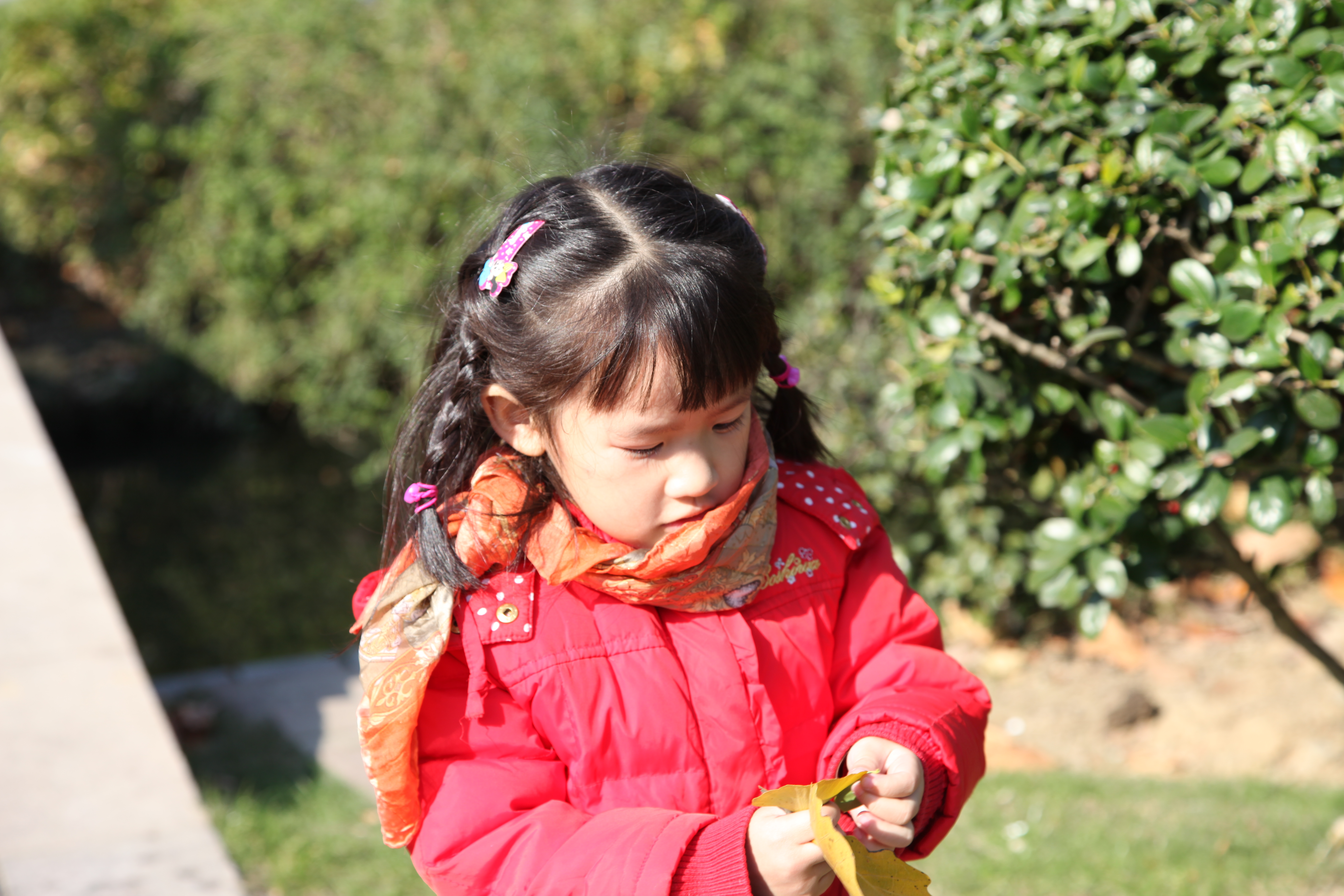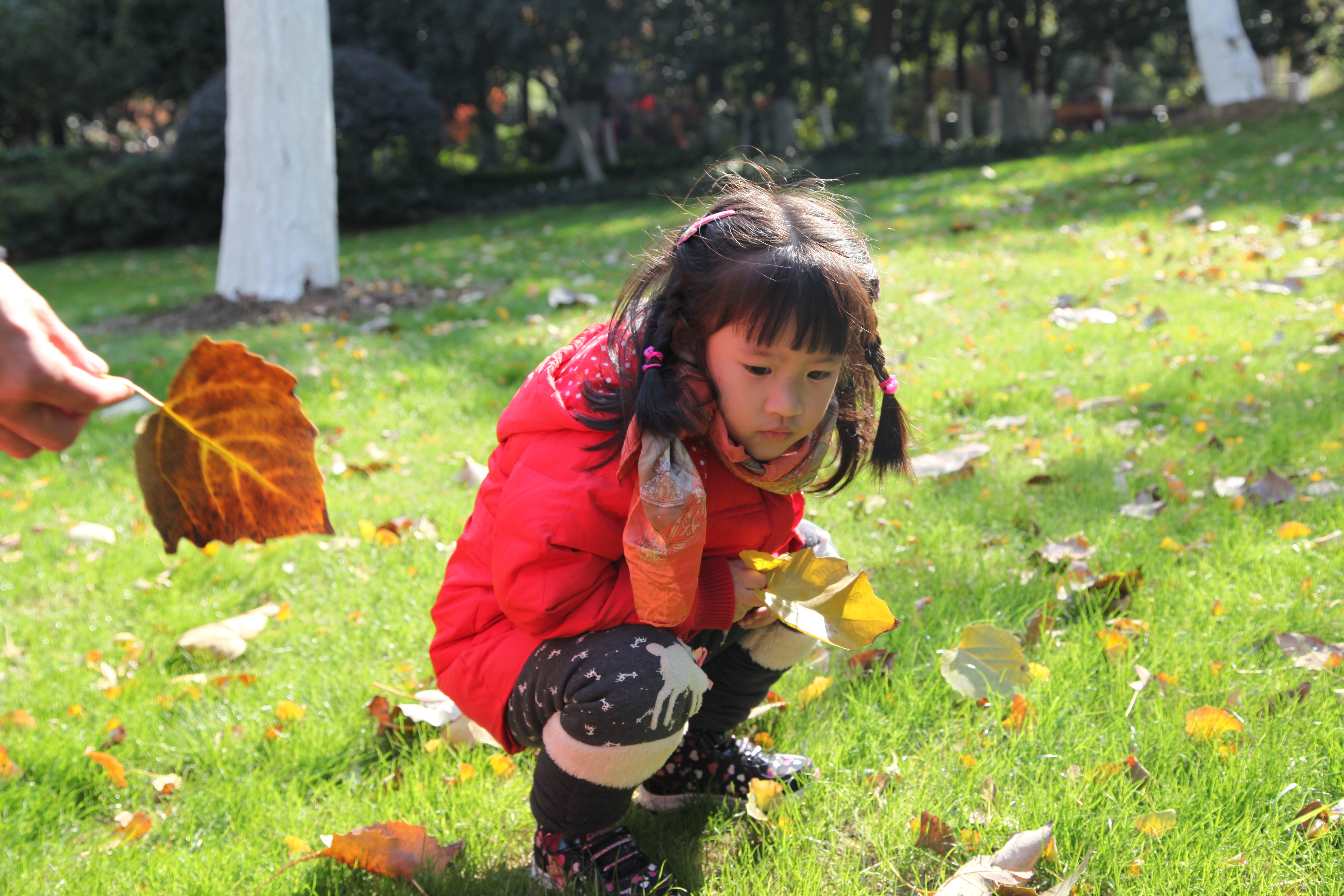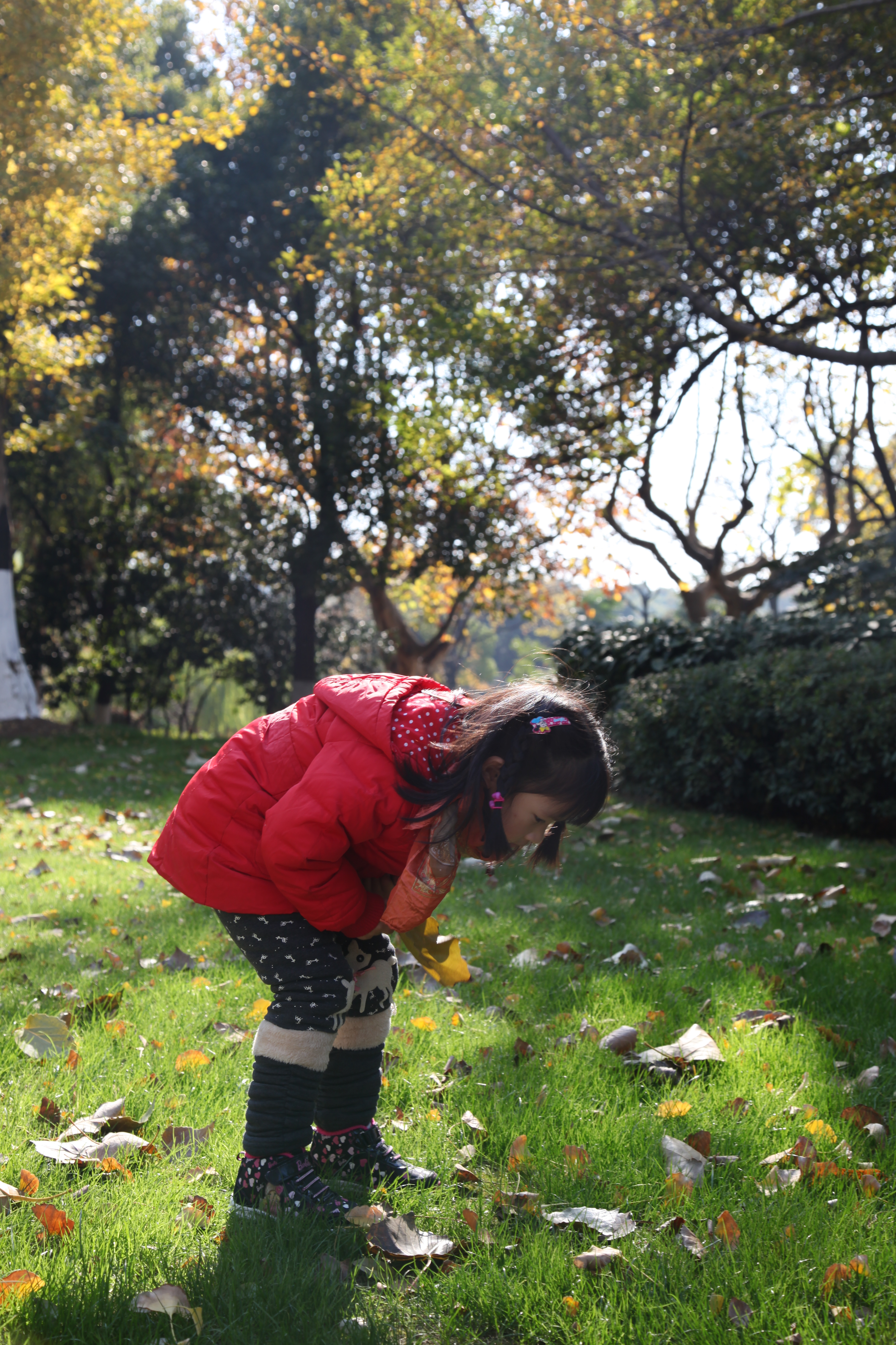 图片介绍:公园的一角,小女孩在专注地寻找落叶