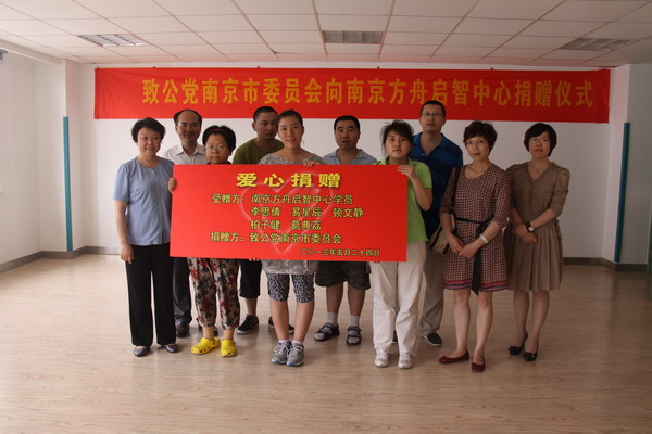5月24日,致公党南京市委刘嘉英副主委、陈玄秘书长及本党党员南京市皓辰口腔门诊主任沈翔、浦口区支部主委、南京江浦泉城工贸总公司总经理孙仁荣等一行来到 “南京方舟启智中心”,开展爱心捐赠活动。