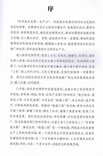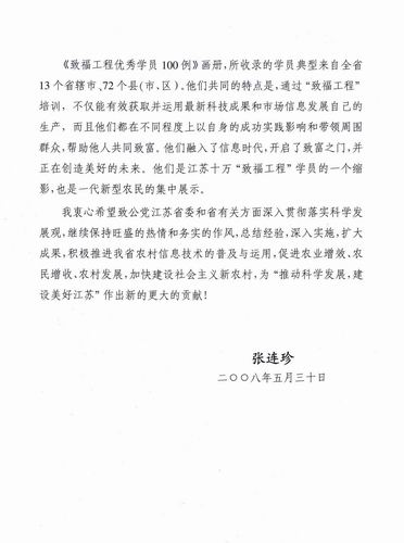 在《序》中,张连珍主席说:“几年前,我在农村调研中欣喜地看到,由致公党江苏省委倡导并发起、省农林、财政、科技、信息产业部门参加的以‘致力扶农,教农民上网,为农民造福’为宗旨的‘致福工程’,由点到面,逐步展开,不断取得新的成效。我感到‘致福工程’的实施,使参与的农民开阔了眼界,掌握了信息,增长了知识,增强了致富本领,促进了农村全面发展。我们及时总结经验、研究部署,在全省范围内组织推广。经过各地各部门的共同努力,目前已有十万农民迈上了‘信息高速公路’。事实证明,‘致福工程’是一个使电脑、网络成为农民新型生产工具的有效实践;是一个用信息化手段改造传统农业、促进农民增收的有效实践;是一个引导城市支援农村,工业反哺农业的有效实践;同时,还是一个多方合作、功能优化的有效实践。”