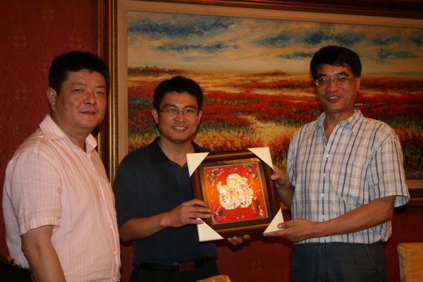 贵州省委副主委宋平(左一)与秘书长潘志建向考察团赠送纪念品
