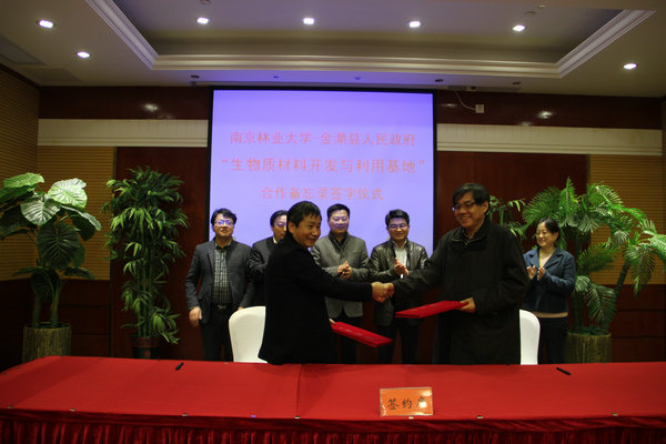 4月10日下午,由致公党南林支部牵线搭桥,南京林业大学与金湖县政府签署了“生物质材料开发与利用基地”合作备忘录。