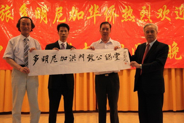 徐利明为多米尼加洪门致公总堂题写牌匾(从右至左:致公党中央常务副主席王钦敏、多米尼加洪门致公总堂主席岑高峰、副主席吴立洪、致公党江苏省委副主委徐利明)。