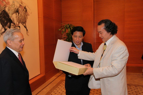 中国驻美国大使张业遂(中)赏阅《徐利明书画篆刻》大型作品集