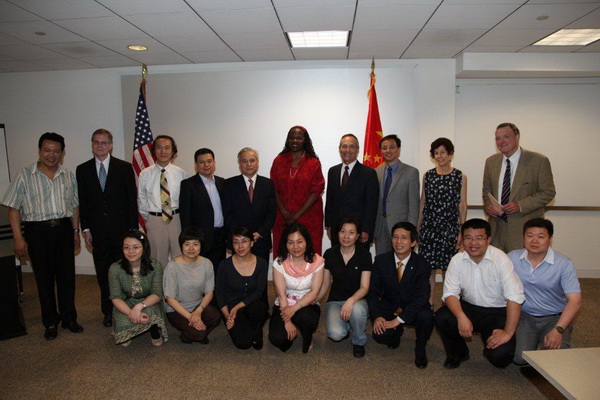 美国安生基金会宴请访问团前合影。(后排中立女:安生基金会资深副主席、前康奈尔大学助理教学校长多莉斯;其右:美国国土安全部副部长阿兰•本森;最右:美国全国私立学校联盟副主席保罗•米勒)