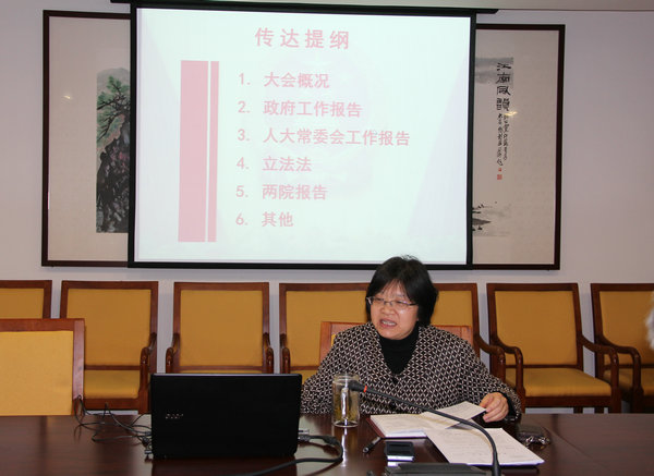 吴晓蓓传达了全国人大会议的主要精神,介绍了政府工作报告、全国人大常委会工作报告、最高人民法院工作报告、最高人民检察院工作报告的主要内容,特别是李克强总理参加江苏代表团审议的情况。