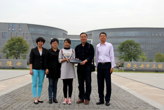 央宗(中)与省直南大支部主委黄继东(右二)、南京大学统战部领导(右一)、省委会机关干部合影