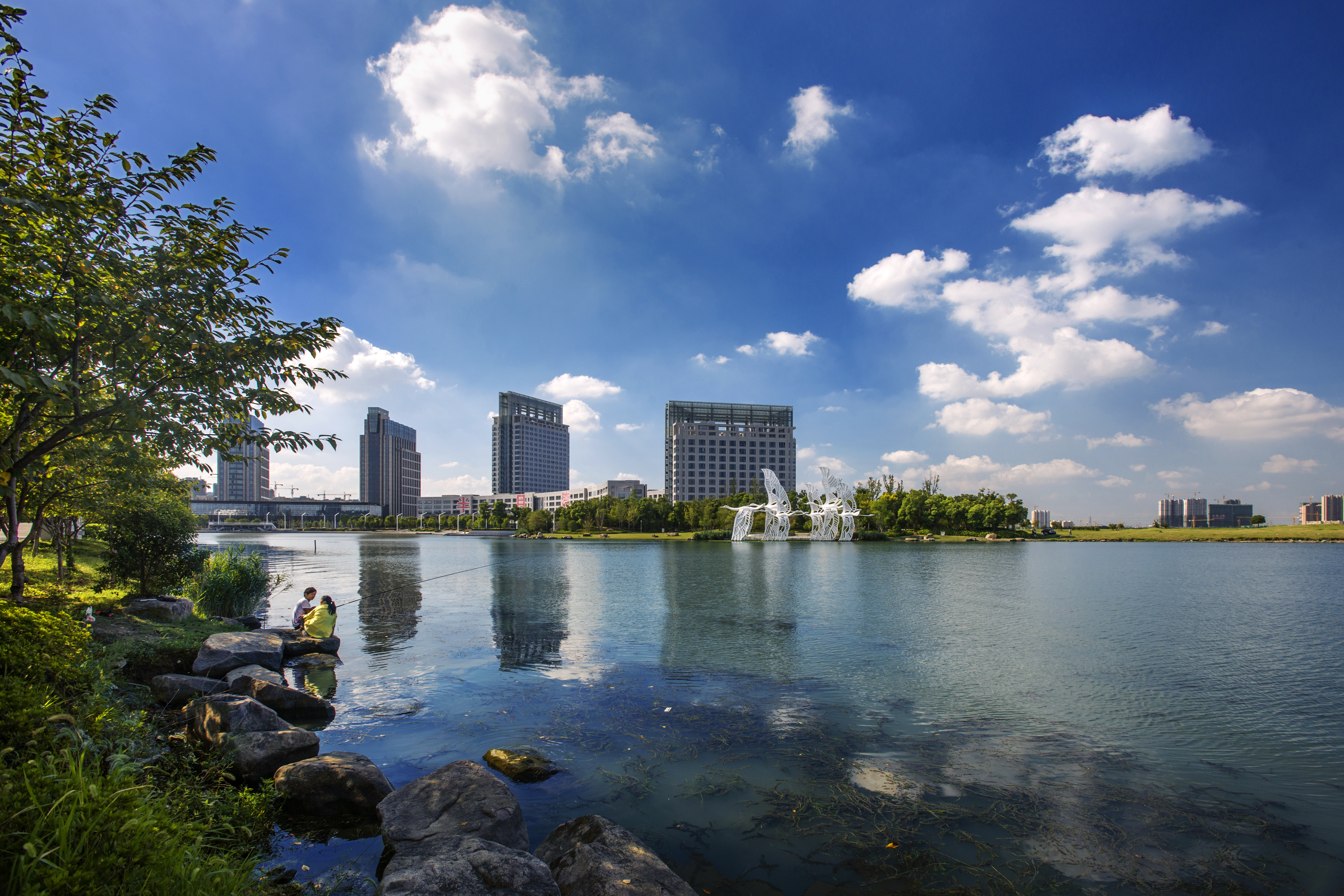 难得好天气,犹喜白云飘。青碧的湖面开阔醉人、彼岸的城区清晰俊朗。