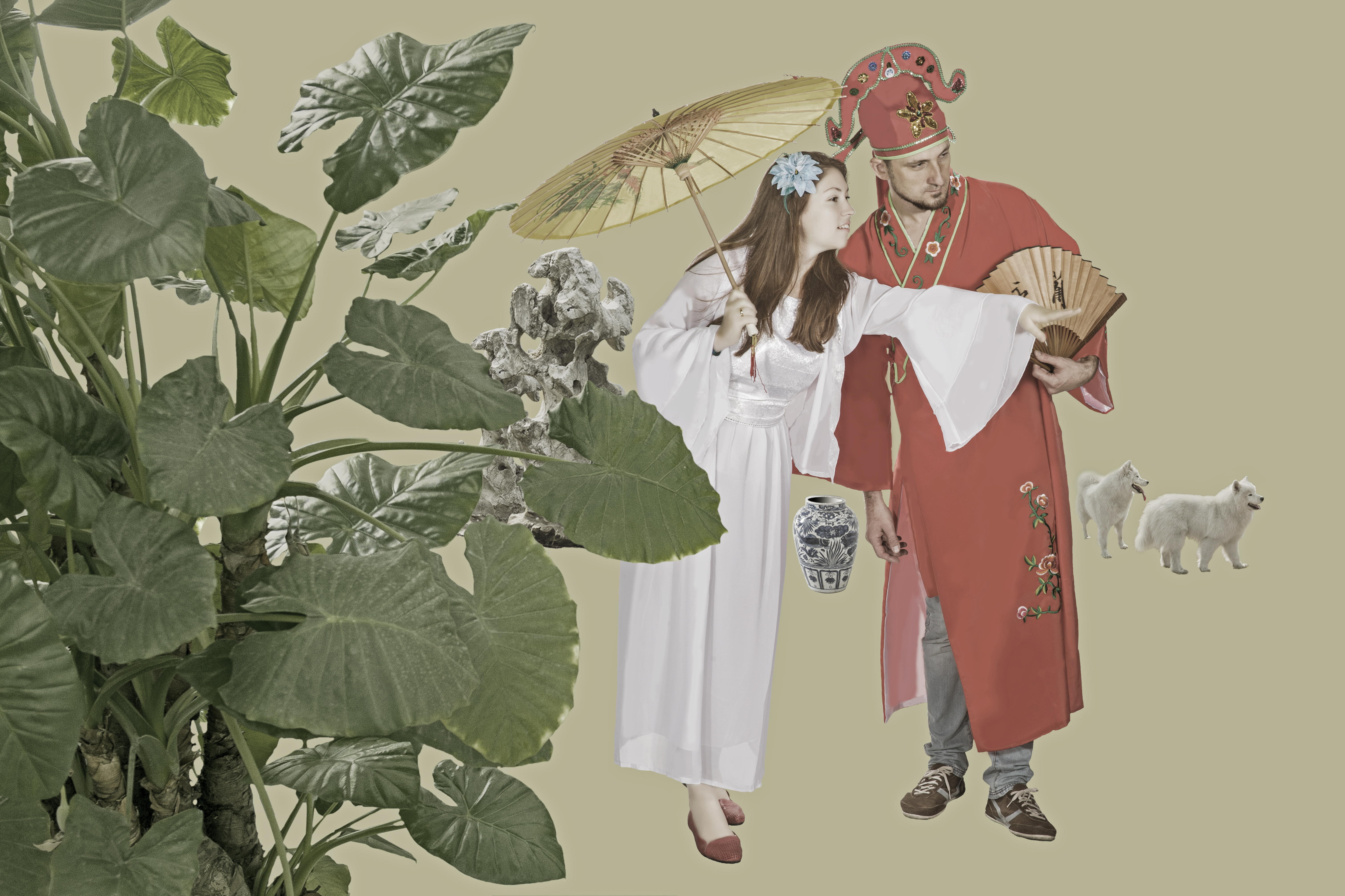 一幅苏州传统生活场景的画面,文人书生、妙龄少女、树木、山石、青瓷、宠物,淡泊娴雅的世风情调。