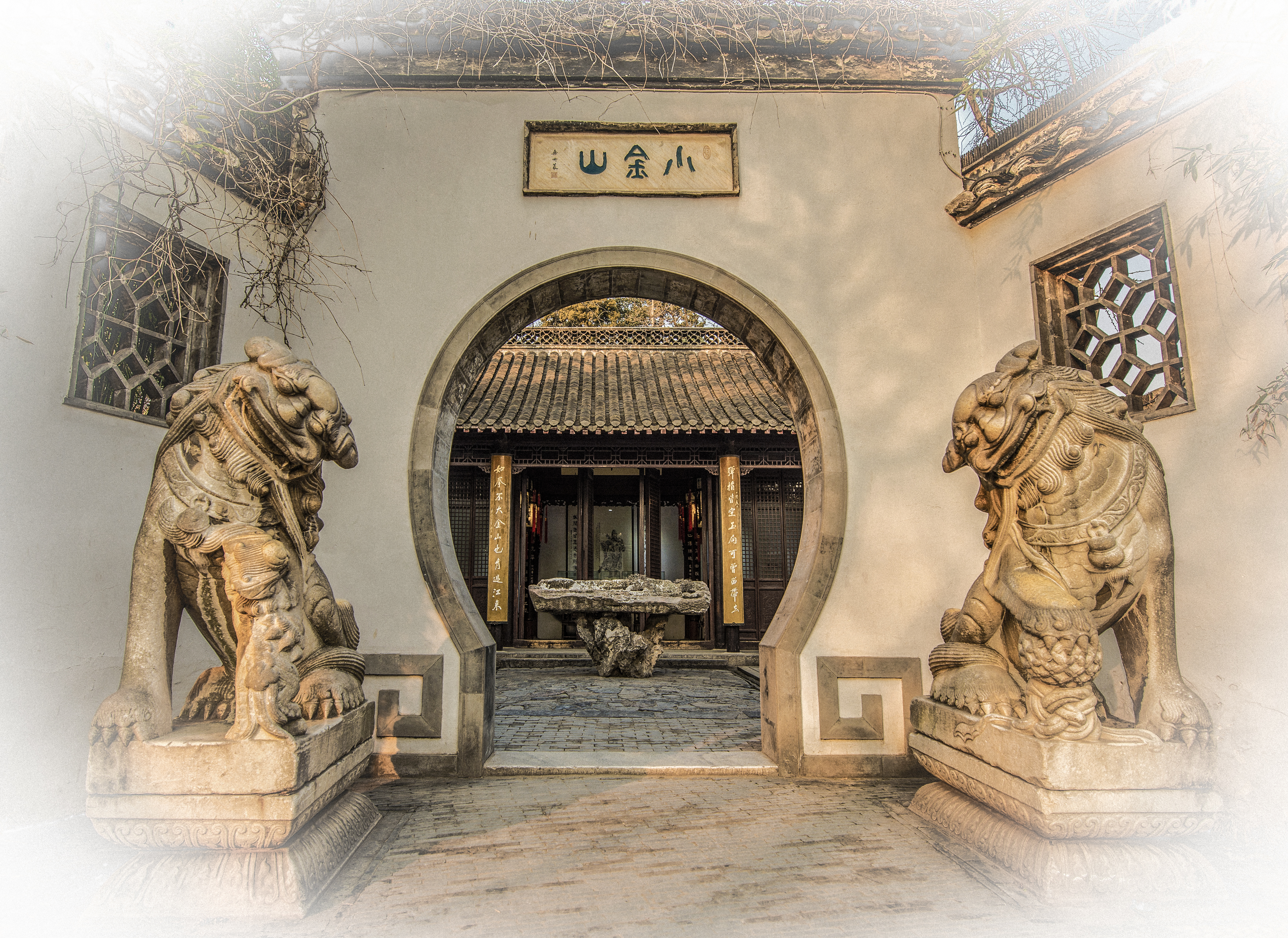 图片介绍:这是一对从别处移来的古代石狮,母狮子带着小孩,公母狮子一天到晚相互微笑,恩爱千年不变。感人,动人!