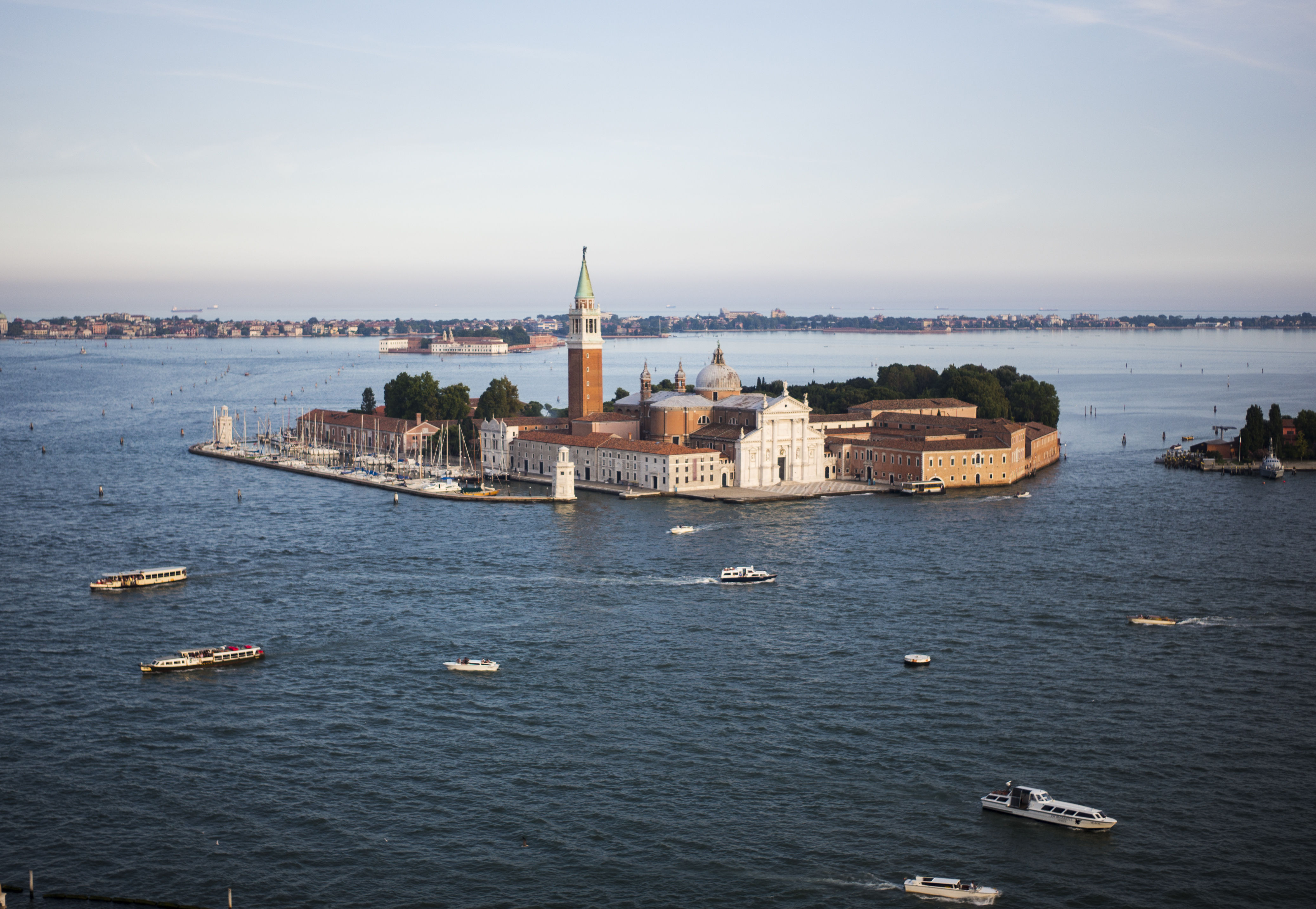 圣乔治雷岛位于威尼斯主岛旁边,岛上有著名的圣乔治马焦雷教堂。威尼斯水城已经快要被海水淹没,有时连续的下大雨,就能将威尼斯的街道淹没在水中。海中的船担负着威尼斯的水上公交的作用,一根根的小木桩是船的航道。