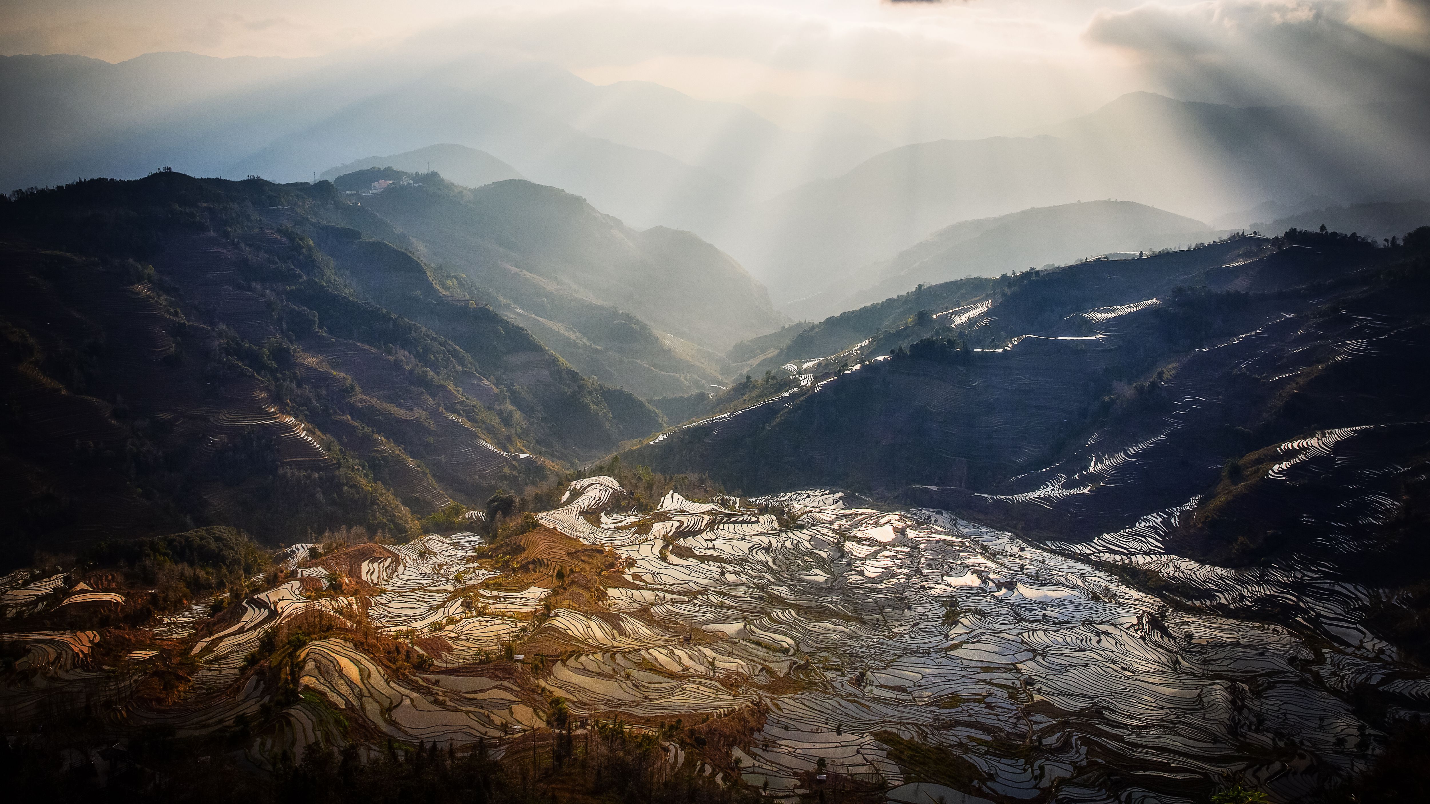 图片介绍:黎明时分,阳光透过云雾照射在梯田上方,形成了美妙的光影效果