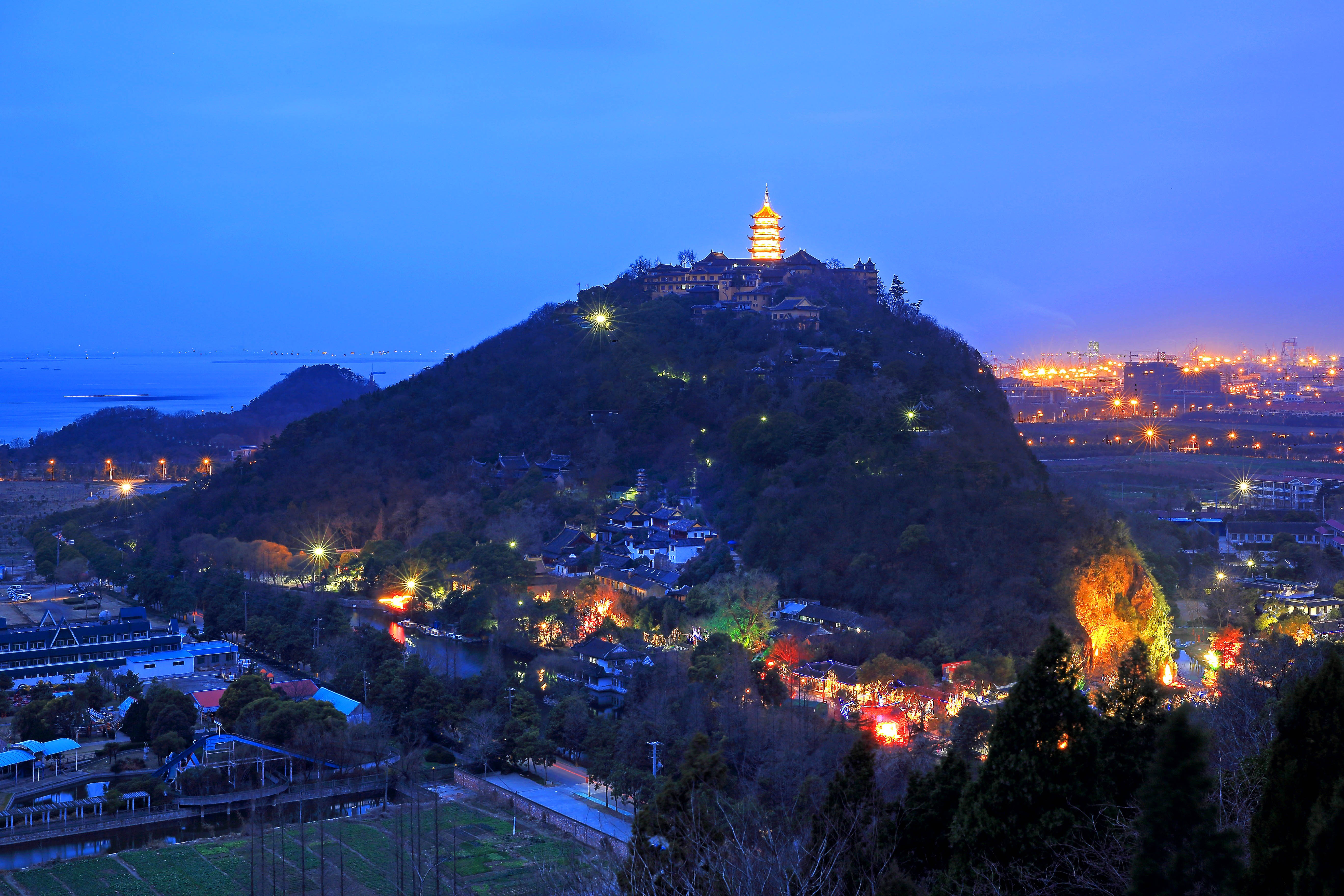 图片简介:夜幕之下,狼山华灯初上,貌似佛光普照,远处是浩瀚的长江和灿烂的城市,组成绚烂的图景。