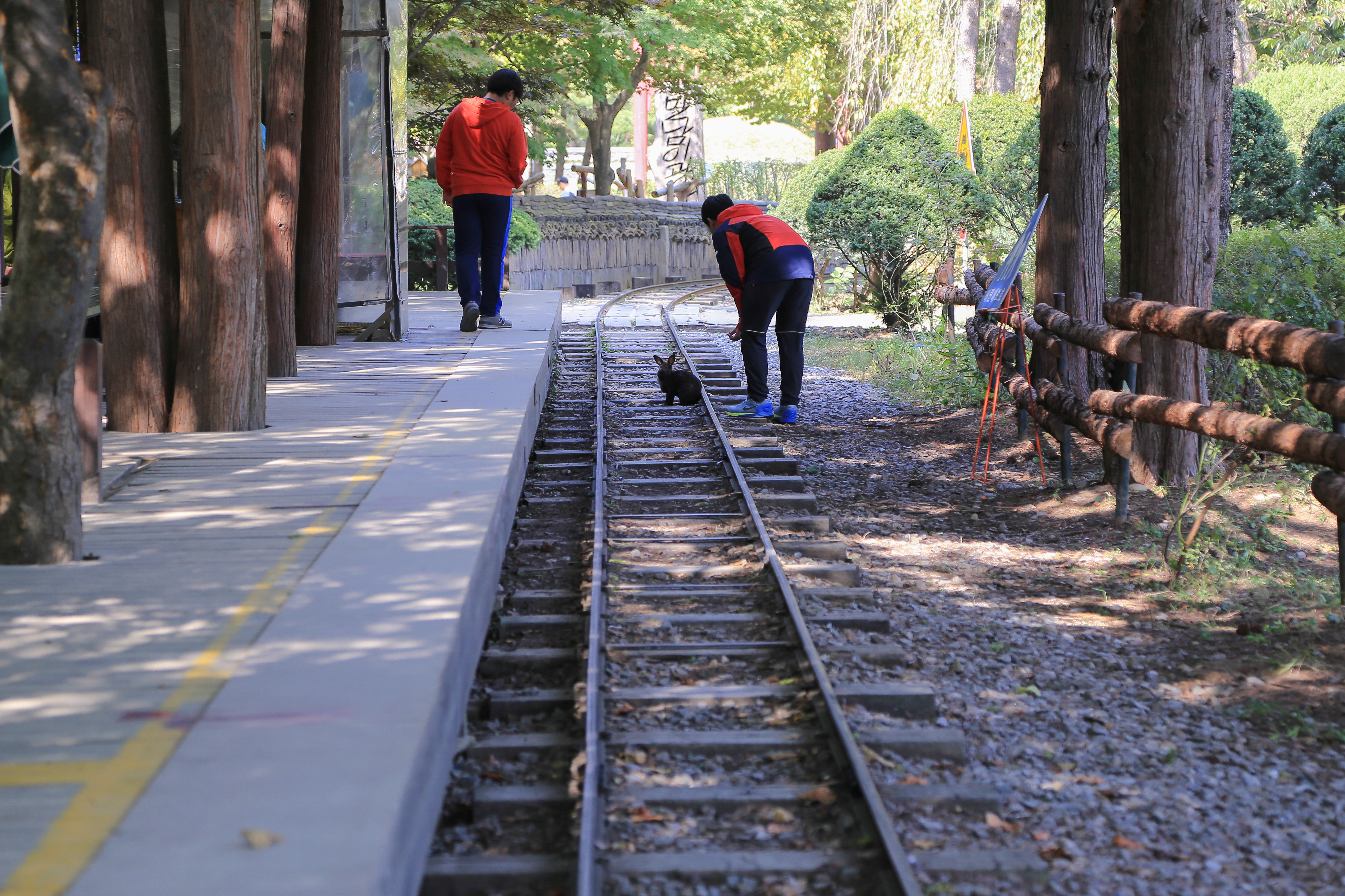 图片简介:在游乐园的小火车轨道上,一个小兔子闯了上来,此时小火车即将驶来,为了小兔子的安全,游乐园工作人员迅速把小兔子请走。这一图景,颇有乐趣。