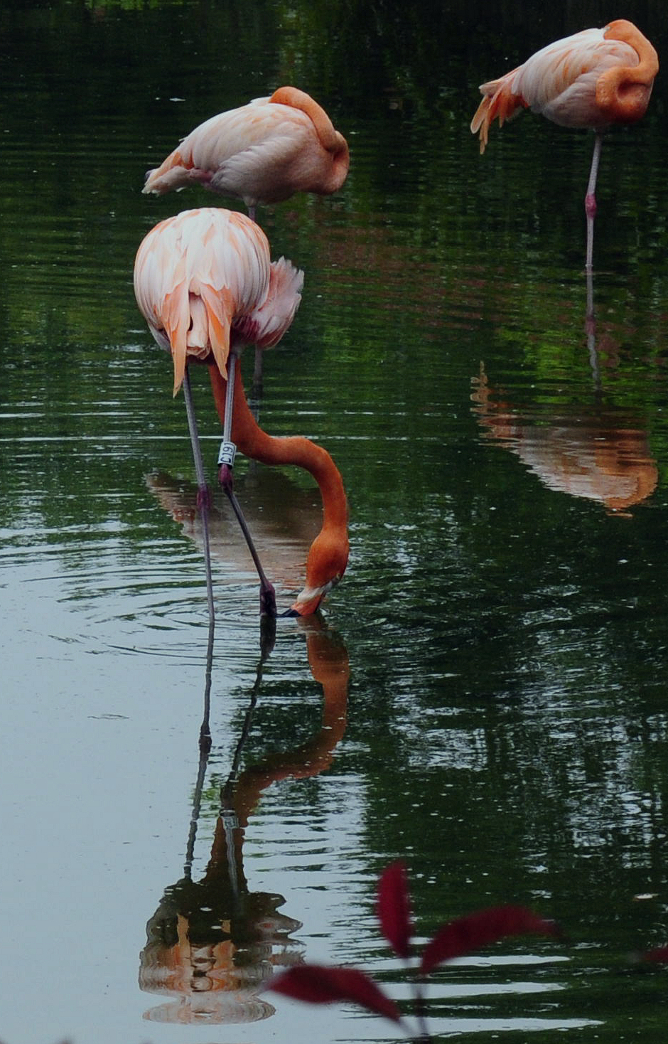 图片简介:火烈鸟长颈向后弯,跨过右腿后方觅食。平静的池塘,泛起涟漪。