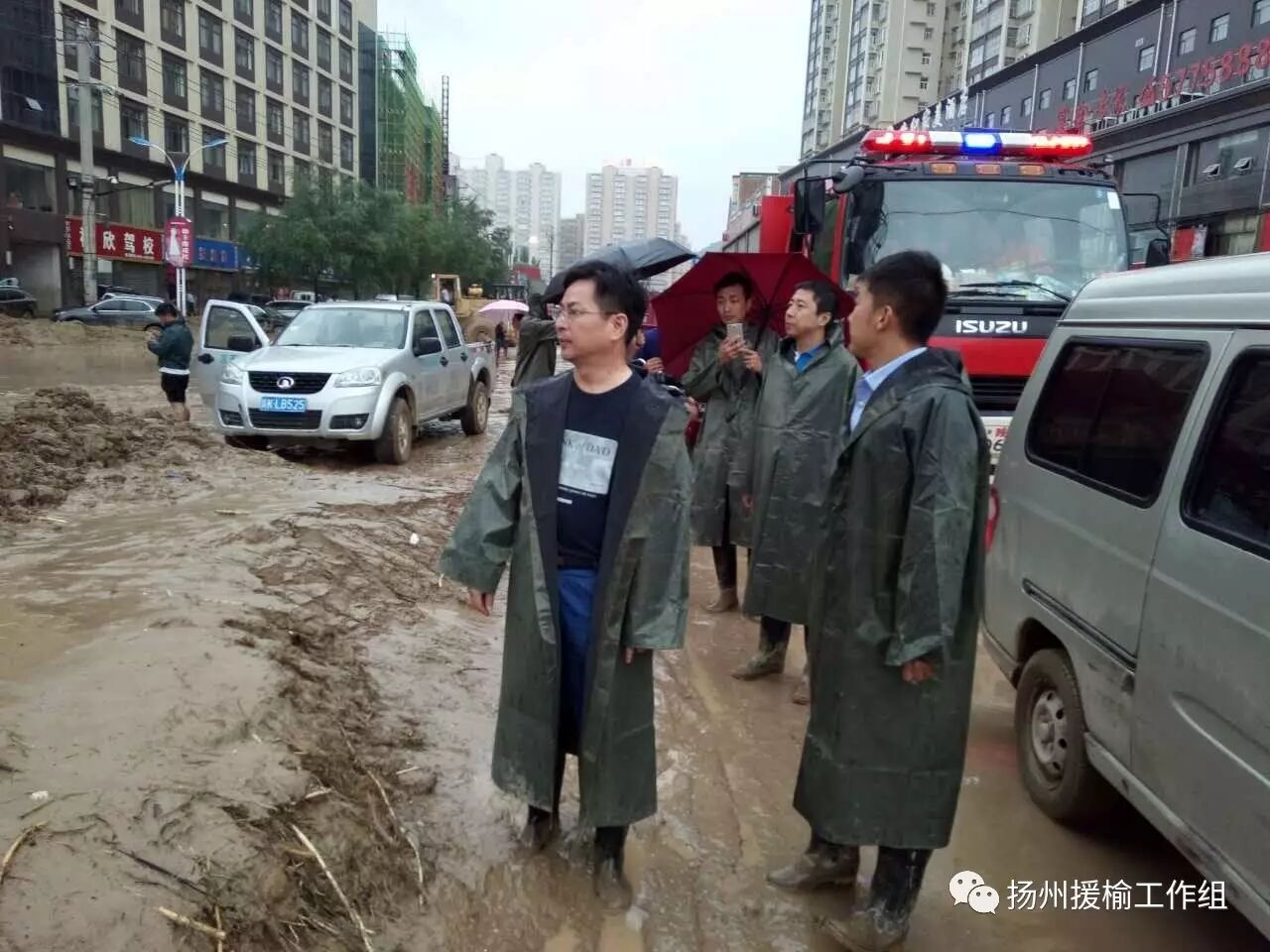 7月23日,陕西榆林突发特大暴雨灾害,特别是7月26日绥德、子洲等地再次遭遇特大暴雨灾害后,扬州市对口援助绥德县负责人、致公党扬州市委主委徐晟带领驻地工作人员,按照当地县委、县政府的统一分工和指挥,积极投身抗洪抢险和受灾群众救助、人口转移、灾后清淤和因灾致死畜禽处理等工作,工作组成员与当地群众同吃、同住、同劳动,不言苦、不怕累,给当地群众留下了很好的印象。