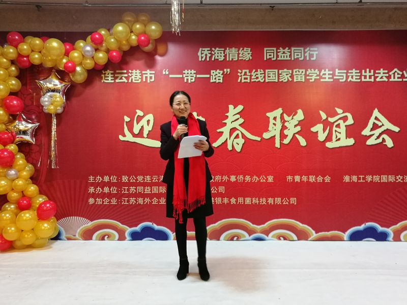 2月9日下午,由致公党连云港市委、市政府外事侨务办公室、市青年联合会、淮海工学院国际交流与合作处共同主办,江苏同益国际物流股份有限公司承办,江苏海外企业集团、连云港银丰食用菌科技有限公司参加的连云港市“一带一路”沿线国家留学生与走出去企业迎新春联谊会在山海国际酒店举行。市政协副主席黄咏梅出席活动并讲话。