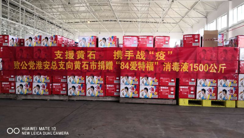 在“致公对口黄石市战疫群”群里,淮安总支副主委王怡第一时间了解黄石市的需求。2月17日,当得知他们紧缺医疗防护物资和消毒液后,王怡第一时间和“84爱特福消毒液”生产企业所在的淮安市金湖县领导取得联系,请求支援。在各类医疗防护物资都紧缺的情况下,金湖县大力支持,帮助协调了1. 5吨消毒液。