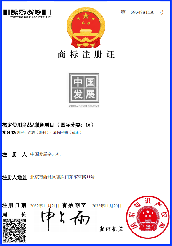 中国发展杂志现已逐步成长为具有良好社会影响力的综合性学术期刊,已连续多年被评为中国人文社会科学期刊AMI综合评价(A刊)扩展期刊,被中国期刊全文数据库、万方数据网中国数字化期刊群、中文科技期刊数据库、国家哲学社会科学学术期刊数据库收录。“中国发展”商标的确权,将有力打击外部侵权及不正当竞争行为,在新时期推动中国发展品牌建设工作不断取得新成就。