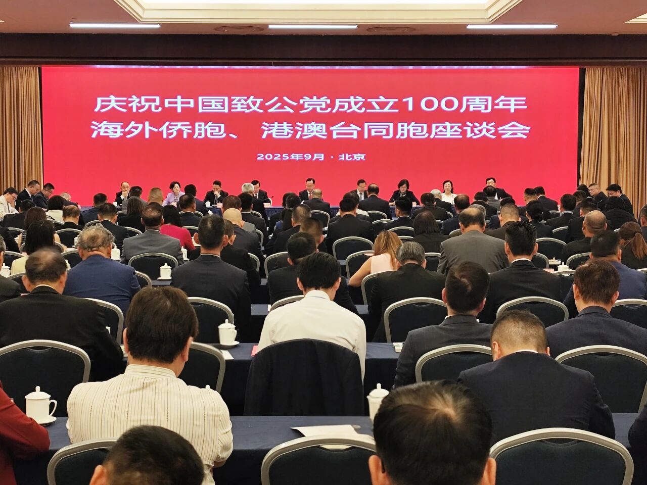 2025年9月19日下午,致公党中央在京举行庆祝中国致公党成立100周年海外侨胞、港澳台同胞座谈会。全国政协副主席、致公党中央主席蒋作君出席座谈会并讲话,常务副主席张恩迪主持座谈会。副主席曹鸿鸣、吕彩霞、杨兴平、闫傲霜、徐晓兰出席座谈会。副主席兼秘书长卢国懿出席座谈会并致欢迎辞。