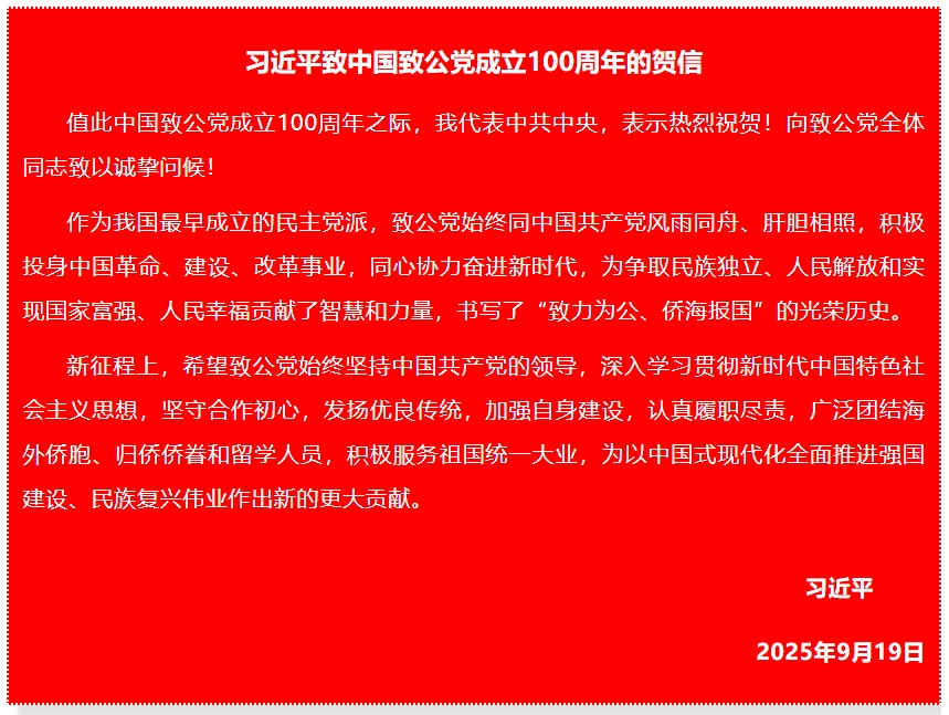 在中国致公党成立100周年之际,中共中央总书记、国家主席、中央军委主席习近平发来贺信,代表中共中央表示热烈祝贺,向致公党全体同志致以诚挚问候。